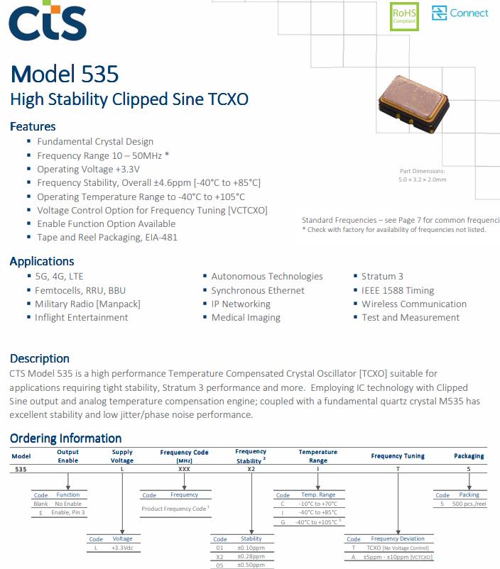更多>>CTS發(fā)布高性能微型精密TCXO振蕩器535L160X21T5,適用于要求緊密穩(wěn)定性的軍事無線電