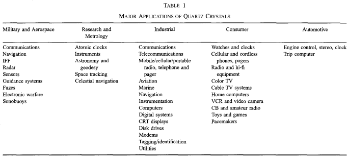 在人造單晶中,石英的生長量僅次于硅.每年大約生長2500到3000噸石英晶體(大約是硅生長量的3到4倍).主要應(yīng)用是時(shí)鐘和頻率源的振蕩器.其他重要應(yīng)用是傳感器和用于頻率選擇的濾波器.每年制造大約2xl09體聲波(BAW)石英諧振器和幾億個(gè)石英聲表面濾波器(聲表面波)器件. 石英晶體的主要應(yīng)用見表1.第四欄和第五欄中的應(yīng)用程序占年度生產(chǎn)的大部分,但第一欄和第二欄中的應(yīng)用程序要求最高.