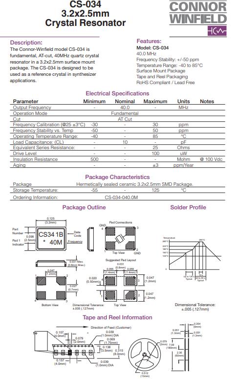 編碼CS-034-027.0M,型號CS-034,Connor-Winfield模型CS-034是基本,at切割,40MHz石英晶體,SMD晶振,無源諧振器,3.2x2.5mm表面安裝的諧振器包中。CS-034被設(shè)計成在合成器中用作參考晶體應(yīng)用程序。