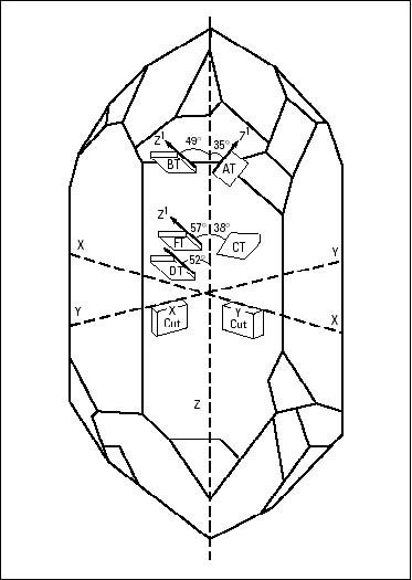 晶片的切割可分為AT-CUT, BT-CUT, CT-CUT, DT-CUT, FT-CUT, XT-CUT, YT-CUT,如圖所示.它是以光軸(Z軸)為參考而命名,每種切法對(duì)應(yīng)一個(gè)角度.采用何種切法應(yīng)根據(jù)實(shí)際情況而定,如對(duì)溫度特性要求較好則應(yīng)采用AT-CUT,如果對(duì)晶振要求的頻率較高時(shí)則采用BT-CUT.晶片的切割方式、幾何形狀、尺寸等決定了晶振的頻率.