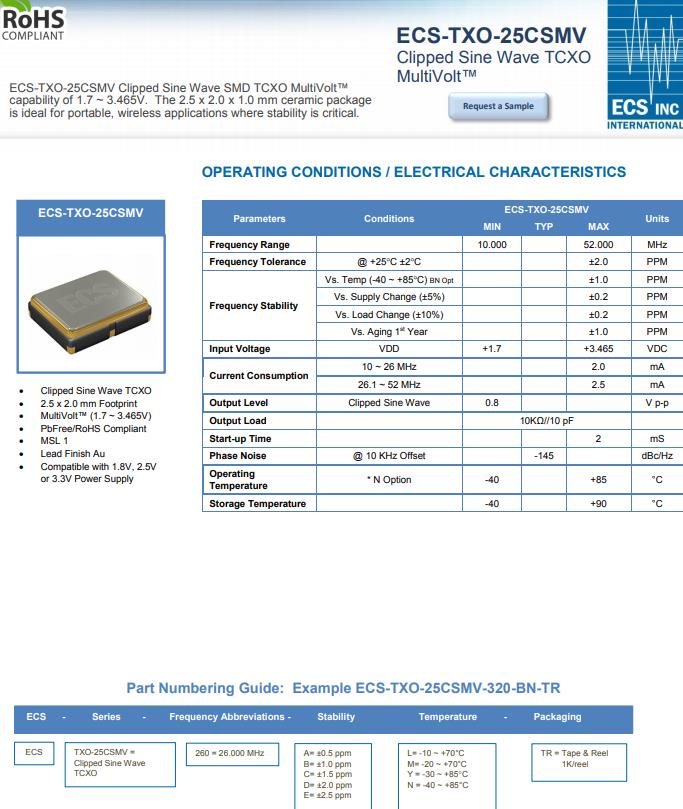 ECS-TXO-25CSMV Clipped Sine Wave SMD TCXO MultiVolt™ capability of 1.7 ~ 3.465V. The 2.5 x 2.0 x 1.0 mm ceramic package is ideal for portable, wireless applications where stability is critical.