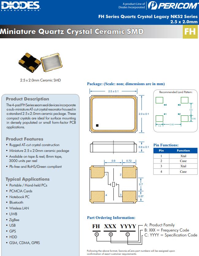 | FH1200004 | Diodes晶振 | SaRonix-eCera™ FH | 12MHz | ±15ppm |