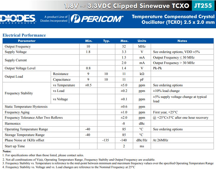 JT255系列是高性能溫度補(bǔ)償振蕩器,具有削波正弦波輸出,可實(shí)現(xiàn)非常低的工作電源電流。1.8V~3.3VDC削波正弦波TCXO,它支持各種電源電壓、穩(wěn)定性和其他功能。它旨在滿足現(xiàn)有的應(yīng)用需求。特征: