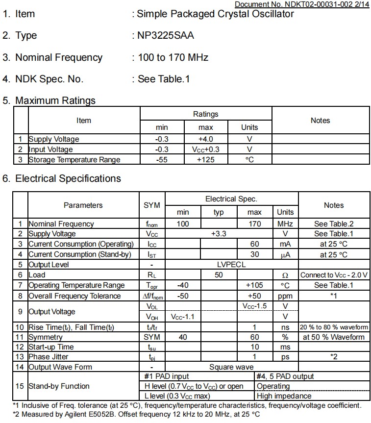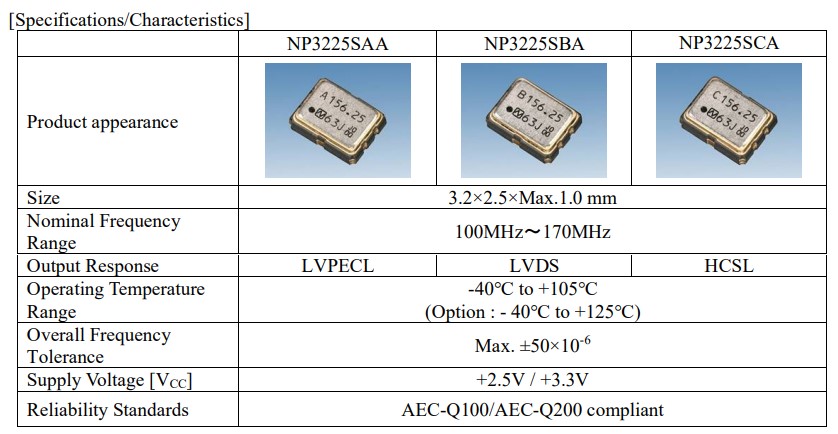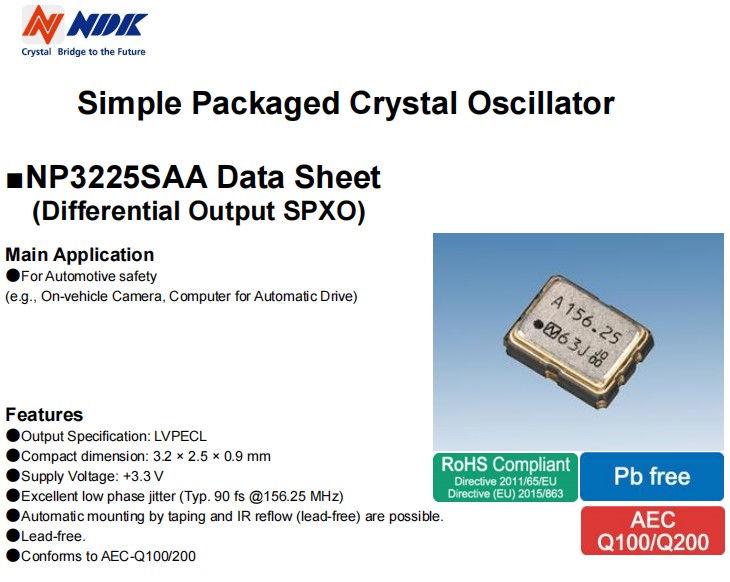 針對汽車安全應用開發了業界首款NP3225SAA/NP3225SBA/NP3225SCA,小體積尺寸3.2x2.5mm,六腳貼片晶振,LVPECL差分晶振,有源晶振