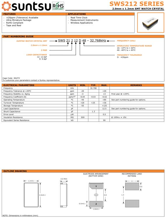 | SWS21212D48-32.768K | 2.0X1.2 CERAMIC SMD (2 PAD) Watch Crystal | 12.5pF | ±20ppm | -40℃ - +85℃ | 32.768K |