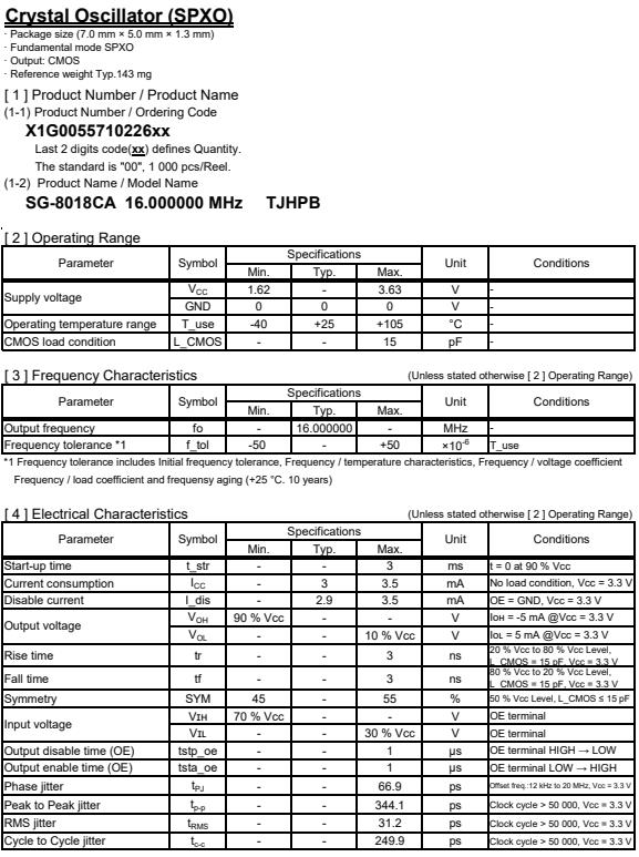 | X1G005571020600 | SG-8018CA | 33.333330 MHz | 7.00 x 5.00 x 1.40 mm | CMOS | 1.620 to 3.630 V | -40 to 105 °C |