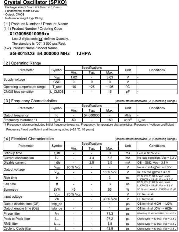 | X1G005601009900 | SG-8018CG | 54.000000 MHz | 2.50 x 2.00 x 0.80 mm | CMOS | 1.620 to 3.630 V | -40 to 105 °C | +/-50 ppm |