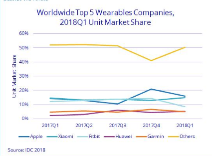 在全球可穿戴設備出貨量排行前五的分別是蘋果、小米、Fitbit、華為以及Garmin,其中,蘋果憑借可以插電話卡的Apple Watch實現了高速增長,其中Apple Watch的出貨量同比增長13.5%,整體市場份額也增長至16.1%;國內的廠商中,小米則以14.8%的市場份額排名第二,但卻因其低廉的售價導致銷售額不是很高。除小米外,華為憑借5.2%的市場份額在本季度排名第四。但值得注意的是,其他產商仍然占據了整個市場份額的50.3%。