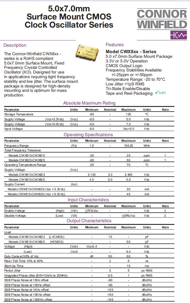 CWX813-080.0M,ConnorWinfield無鉛環(huán)保晶振,7050mm有源晶振,無線應(yīng)用晶振,參數(shù)表
