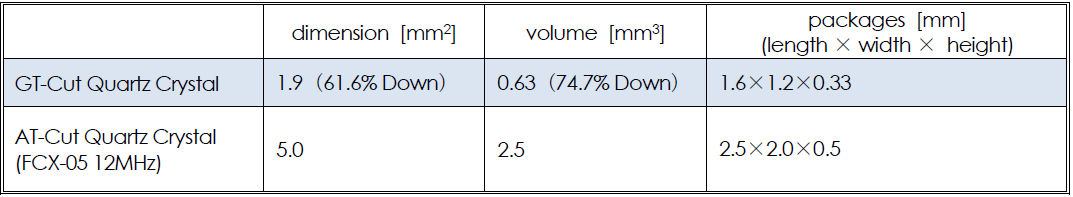 GT-cut石英晶體單元最初是在20世紀40年代作為具有卓越頻率-溫度特性的部件開發(fā)的,它在毛坯制造方面提出了挑戰(zhàn),限制了體積生產(chǎn)。另一方面,AT-cut石英晶體單元近年來出現(xiàn)了向支持更高頻率以響應更小封裝的趨勢,產(chǎn)生對更小封裝的需求,在較低MHz頻率下工作的低功率單元。