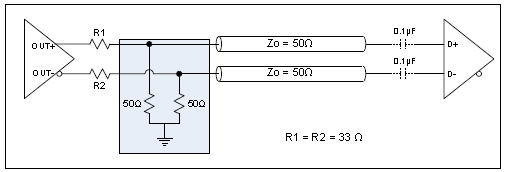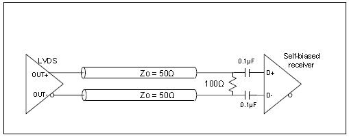 圖5:帶有內部端接和偏置的LVDS驅動器與自偏置差分接收器的連接