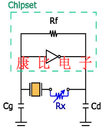 步驟1-5.下圖顯示為一般振蕩電路,其中Cd和Cg是外部負載電容,Rf是反饋電阻,Rd是限制電阻. 負電阻(-R)是評估石英晶體振蕩器振蕩電路質量的標準,其值應至少是晶體電阻的五倍,以保持穩定的振蕩.因此,按照以下說明測量負阻是非常重要的: (1)將電阻(Rx)與貼片晶振串聯連接