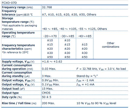 FCXO-07D晶振的時鐘輸出緊湊的設計(1.6mm×1.2mm×0.7mm最大,重量:4.1mg).實現32.768kHZ具有較好的溫度特性比音叉晶體(1 / 10特征曲線的垂直寬度.)更快的上升時間,更高的頻率精度比調諧叉晶體.用電子束密封的陶瓷封裝和金屬蓋,保證了更高的精度和可靠性.無鉛焊接可用.符合RoHS.隨著AEC-Q200依從性的可能性.應用:筆記本電腦、智能機器人、智能家居、DSC、DVC、W-LAN、Smart meter.
