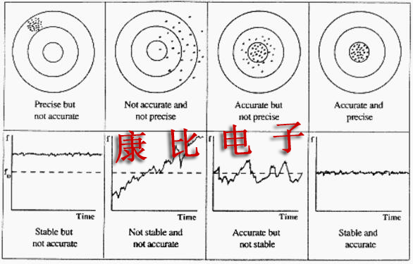 振蕩器表現(xiàn)出各種不穩(wěn)定性.這些包括老化,噪聲和頻率隨溫度,加速度,電離輻射,電源電壓等的變化.術(shù)語(yǔ)精度,穩(wěn)定性和精度通常用于描述振蕩器的不穩(wěn)定性質(zhì)量.圖1說(shuō)明了射手和頻率源的這些術(shù)語(yǔ)的含義.(對(duì)于神射手,每個(gè)彈孔與目標(biāo)中心的距離是"測(cè)量".)