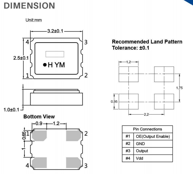 SSW010000I3CHE-T,HELE時鐘振蕩器,HSO321S石英晶振 尺寸圖