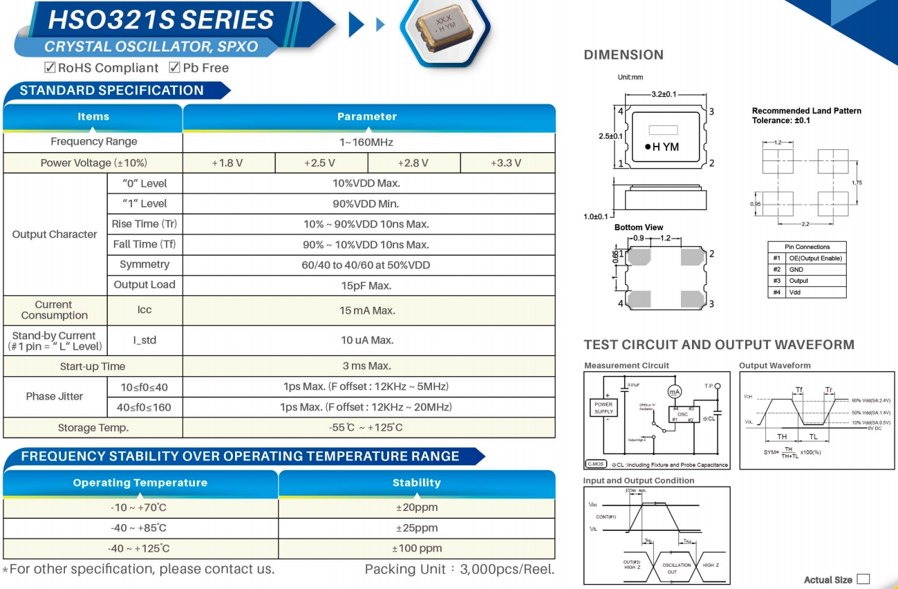 SSW010000I3CHE-T,HELE時鐘振蕩器,HSO321S石英晶振 參數表