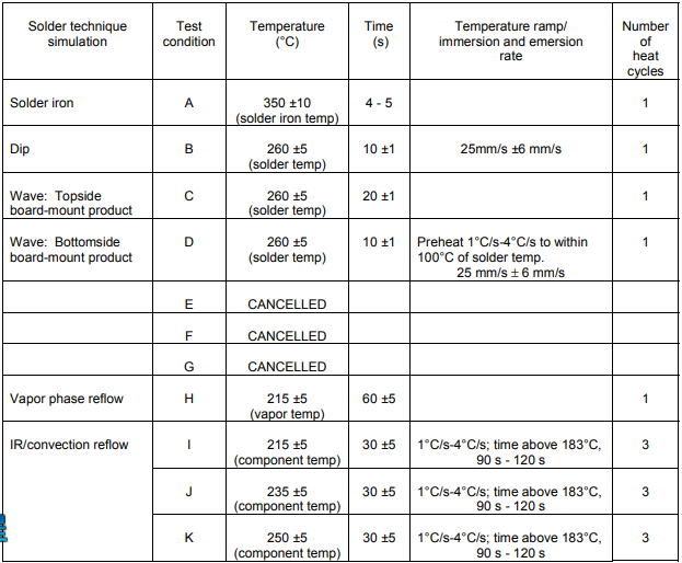 除非個(gè)別規(guī)范中另有規(guī)定,否則應(yīng)在連接至部件的所有焊接端子上進(jìn)行測(cè)試.這些測(cè)試條件涵蓋了六種焊接技術(shù).測(cè)試條件概述如下,見表一.