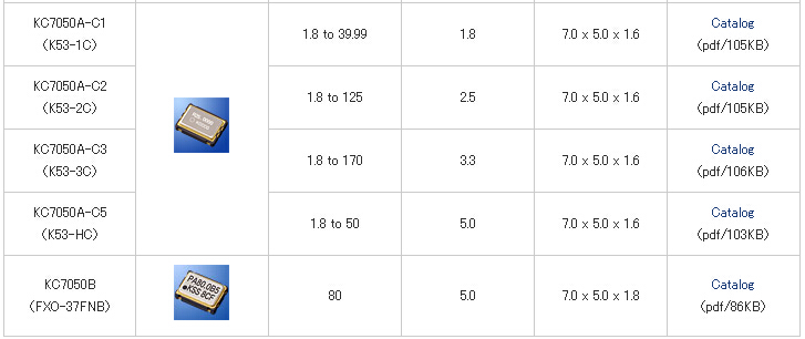 KC7050A-C1-C2-C3-C5 KC7050B振蕩器,KDDI株式會社貼片式石英晶體振蕩器,低電壓啟動功率,并且有多種電壓供選擇,比如有1.8V,2.5V,3.3V,3.8V,5V等,產品被廣泛應用于,平板筆記本,GPS系統,光纖通道,千兆以太網,串行ATA,串行連接SCSI,PCI-Express的SDH / SONET發射基站等領域.符合RoHS/無鉛.
