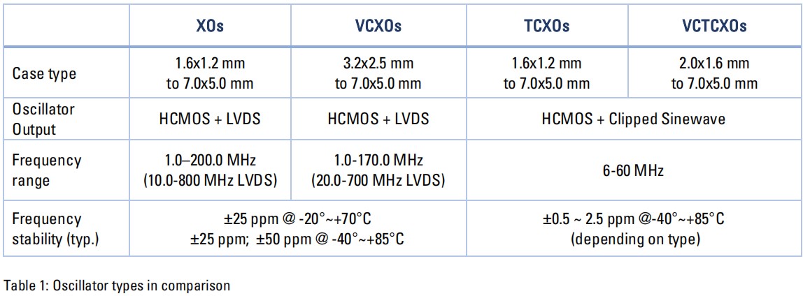 具有標(biāo)準(zhǔn)參數(shù)的最常見的振蕩器類型的概述見下表。這些值只是一個典型的例子。它們?nèi)Q于制造商和類型。