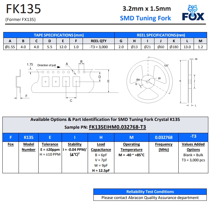 | FX135A-327 | FOX晶振 | FX135A | kHz Crystal (Tuning Fork) | 32.768kHz | - |