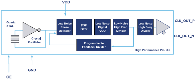從一開(kāi)始,Abracon公司就一直專注于始終如一地實(shí)現(xiàn)這種收斂,并以微型外形生產(chǎn)超低均方根抖動(dòng)時(shí)鐘解決方案.2018年,Abracon公司在其ClearClockTM系列下推出了兩種解決方案,AX5和AX7設(shè)備,分別采用5032晶振和AX7毫米封裝.這些器件基于復(fù)雜的鎖相環(huán)技術(shù),如圖1所示,產(chǎn)生出色的均方根抖動(dòng)性能——載波頻率在12千赫至20兆赫范圍內(nèi)通常優(yōu)于150飛秒.