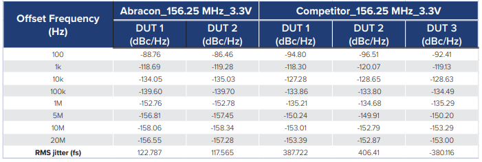 Abracon晶振將AX3系列的性能與主要競(jìng)爭(zhēng)對(duì)手在相同封裝尺寸下的解決方案進(jìn)行了比較.如圖3所示,AX3在156.25MHz載波下的均方根抖動(dòng)性能比主要競(jìng)爭(zhēng)對(duì)手平均高出68%.