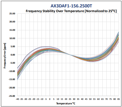 圖4:AX3在-20℃至+70℃時(shí)的穩(wěn)定性為15ppm,在-40℃至+85℃時(shí)的穩(wěn)定性為25ppm