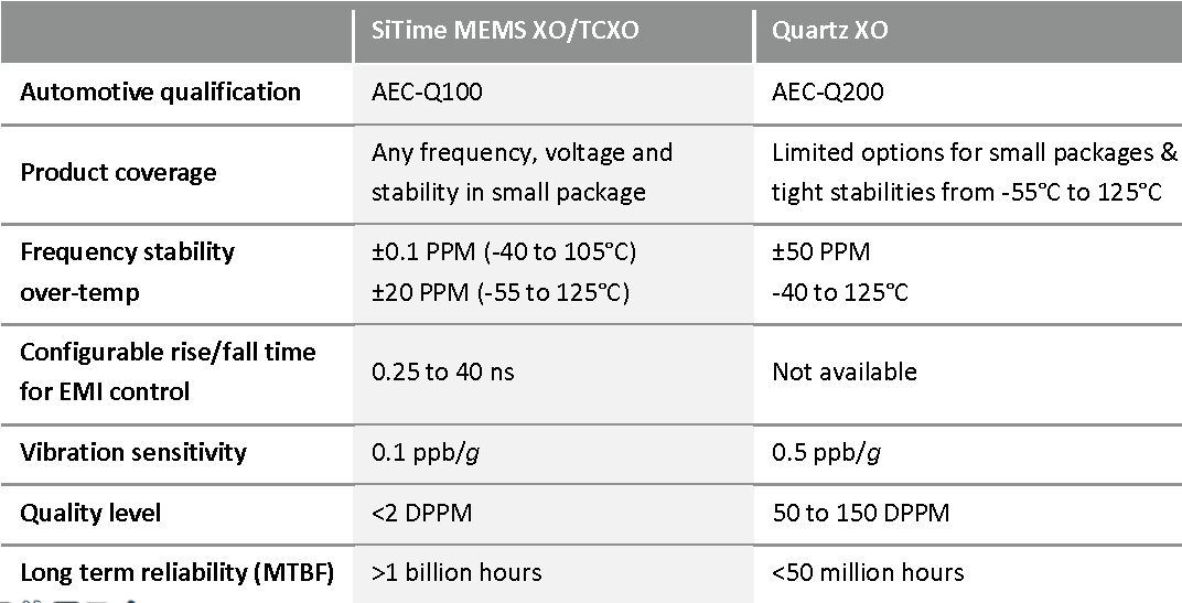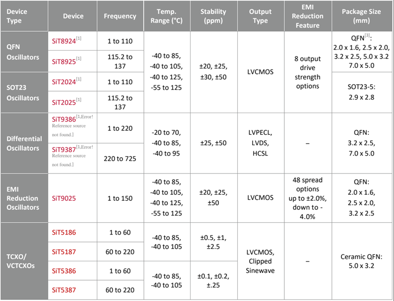 下表列出了SiTime[8]的汽車微機電系統有源晶體系列.