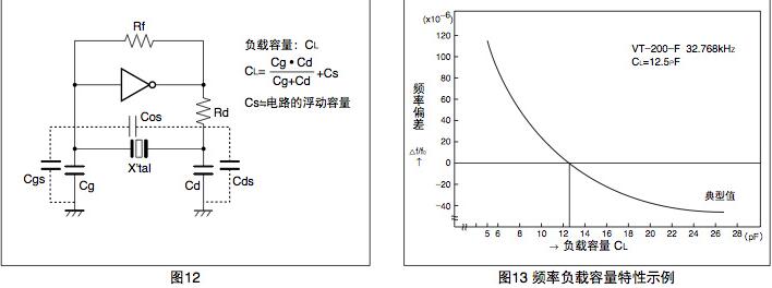 負載容量 (CL) 是用來決定在振蕩電路中晶振頻率的參數,從加在振蕩電路中晶振兩端的電容可知負載容量(參閱圖12). 因振蕩電路的負載容量的不同,晶振的頻率會相應地產生變動.為了獲得目標的頻率精度,必須使晶振與負載容量相匹 配.在使用時,請根據相應晶振的負載容量,將振蕩電路的負載容量設定為與其相符.