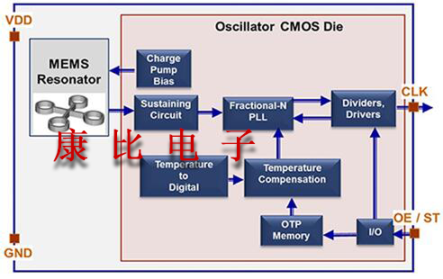 振蕩器/驅動器為MEMS結構提供激勵,并將其輸出饋送至小數(shù)N分頻鎖相環(huán)(PLL),并由該鎖相環(huán)將MEMS器件的輸出頻率乘以可編程因子"N".一次性可編程(OTP)存儲器用于存儲模塊配置參數(shù).溫度補償可通過調節(jié)PLL內的輸出頻率來實現(xiàn).此外,也可對PLL進行編程,從而為振蕩器提供數(shù)字控制的頻率輸出.可編程晶振的最大優(yōu)點是不受機械沖擊和振動的影響,此優(yōu)點是手機,相機和手表等移動應用中的一個重要因素.