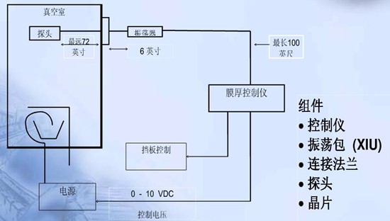 膜厚控制儀用電子組件引起晶振片的高速振動,約每秒6百萬次(6MHz),鍍膜時,測試每秒鐘振動次數(shù)的改變,從所接受的數(shù)據(jù)中計算膜層的厚度。為了確保晶振片以6MHz的速度振動,在真空室外裝有“振蕩器”,與晶控儀和探頭接口連接,振蕩器通過迅速改變給晶振片的電流使晶振片高速振動。